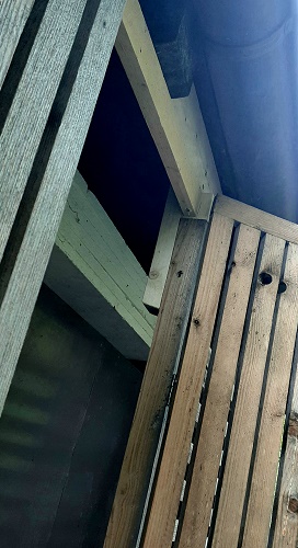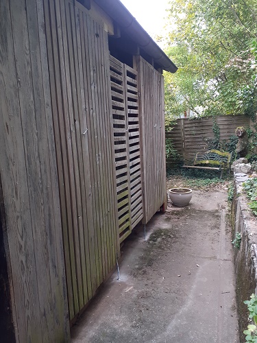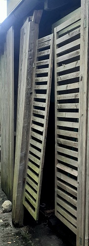 Türen Unterstand Die untersten, morschen 30 cm der Tore abgesägt, alles neu gerichtet und montiert. |