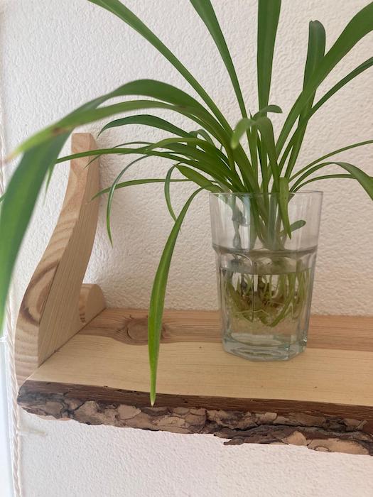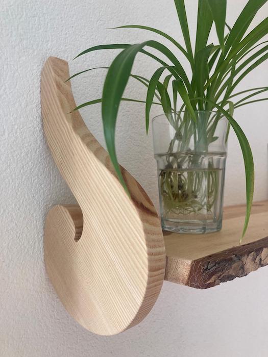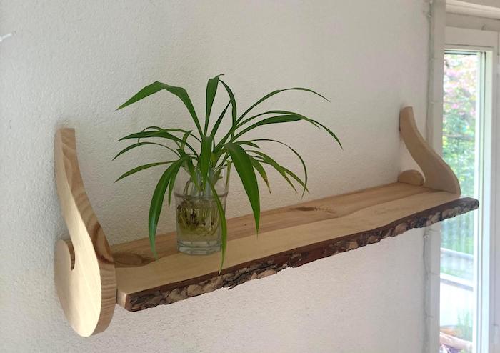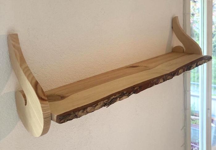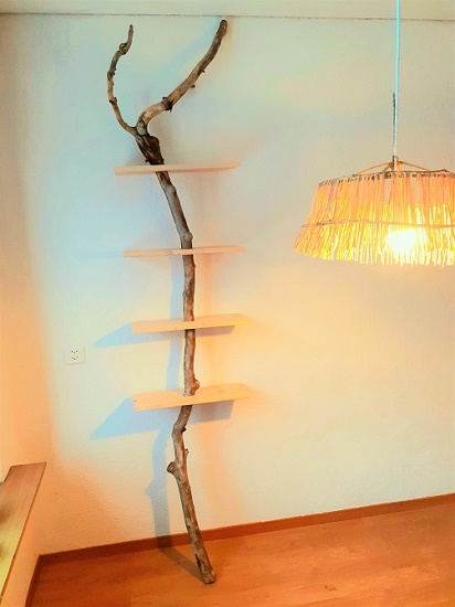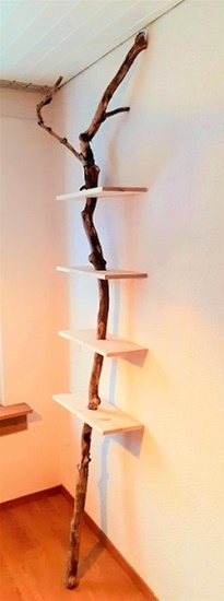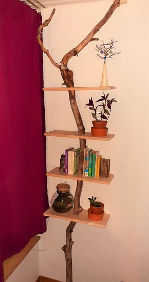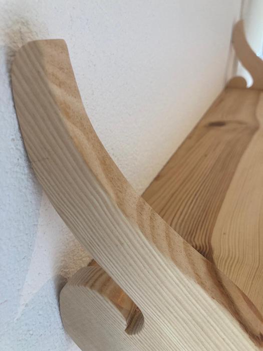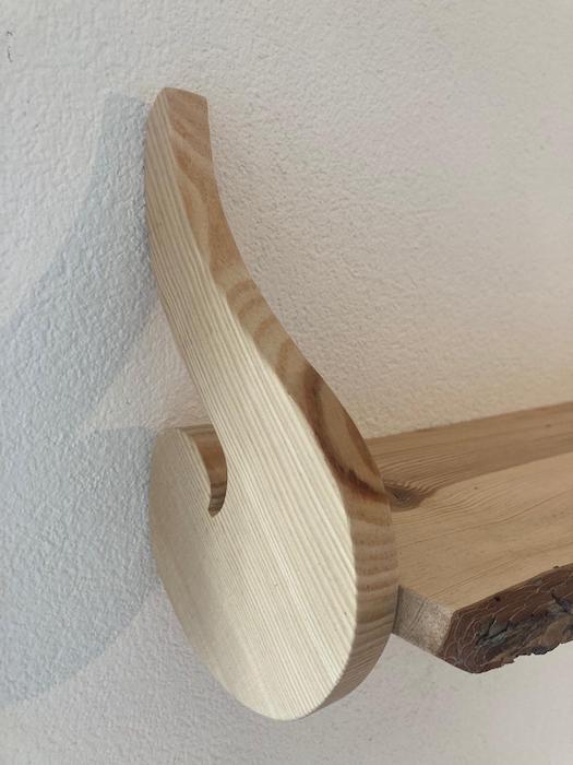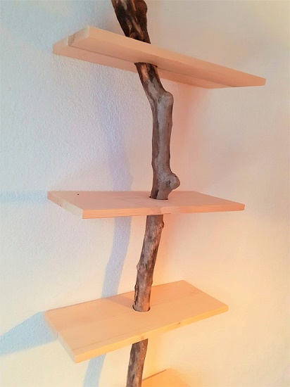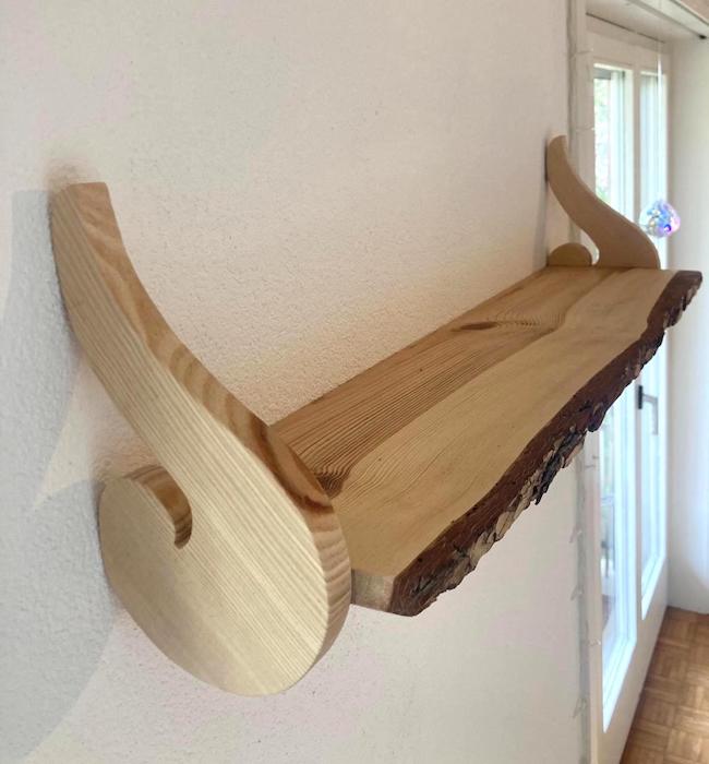 Wandgestell Aus einem Buchenast und Fichtenbrettern, 20 x 50 cm. Hüte sich, wer das Waagrechte fordert, der Buchenast gehorcht höchstens der Luftfeuchtigkeit. |