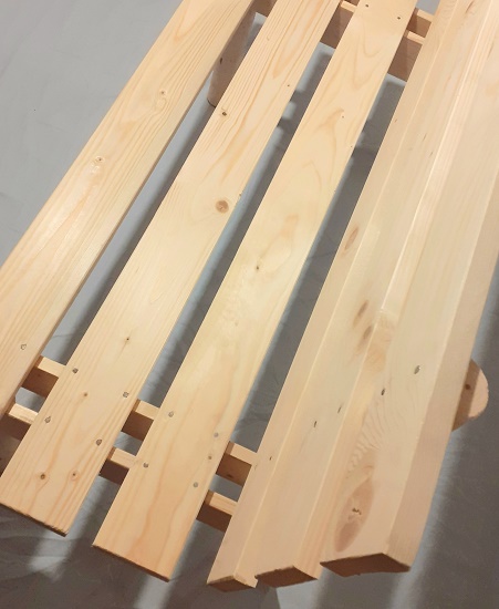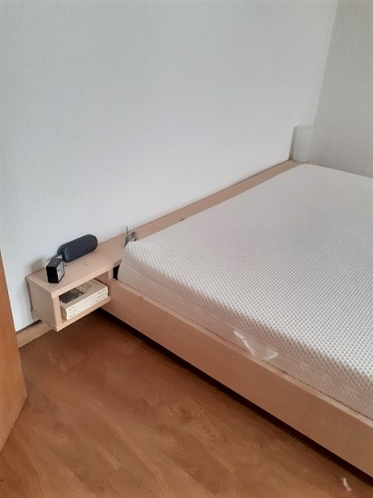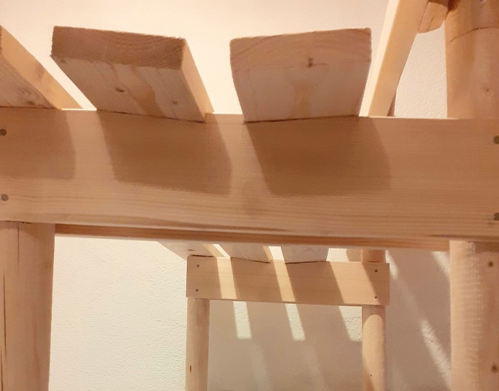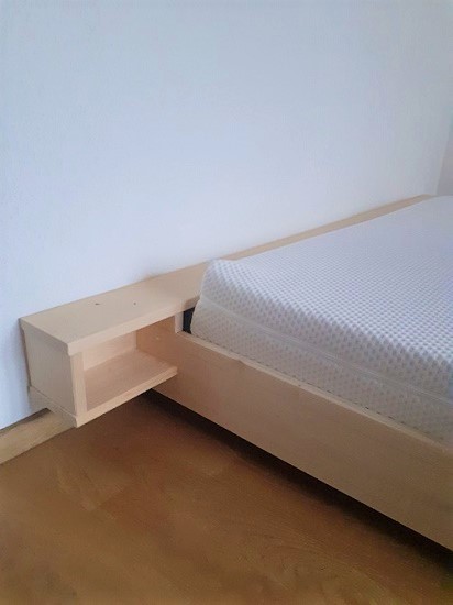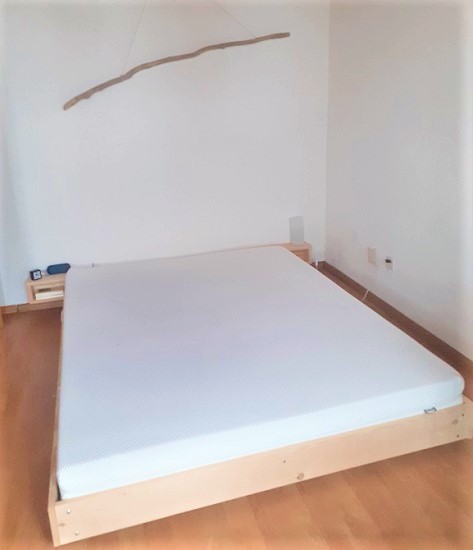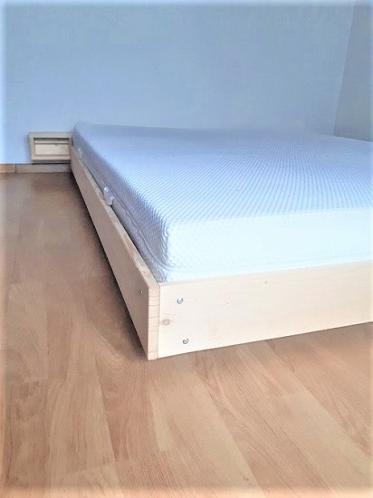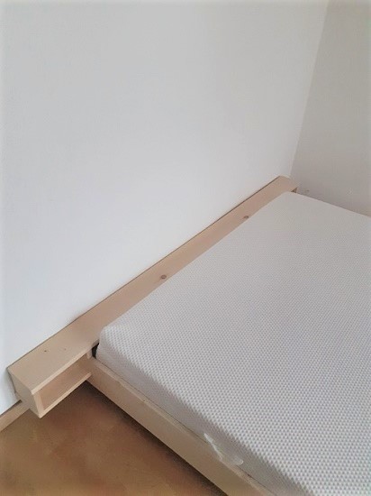 Bettgestell Mit Ablage für Lattenrost und Matratze 160 x 200 cm aus ungehobelten Fichtenbrettern, Konstruktion vorbereitet für Unterbau, z. B. Schubladen oder Füsse. |