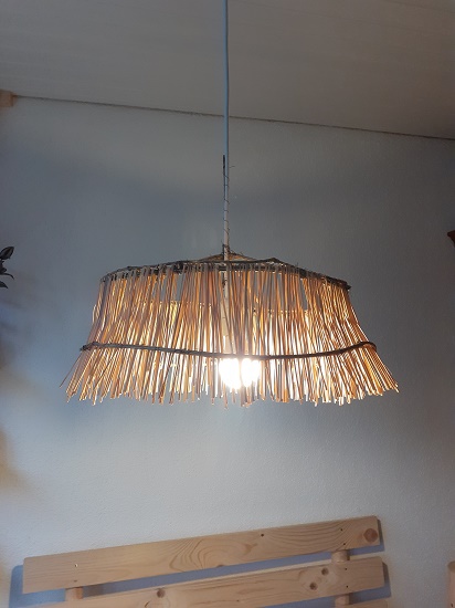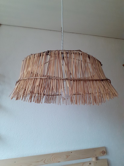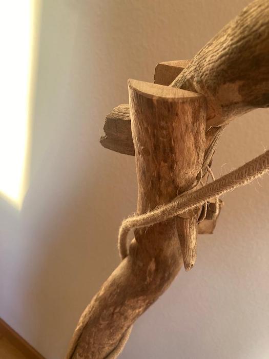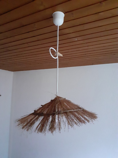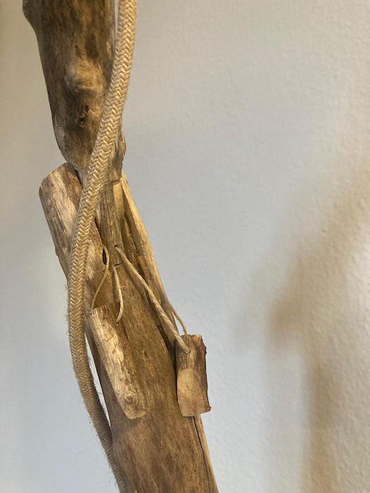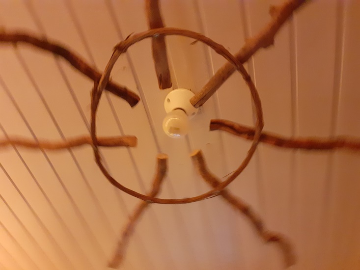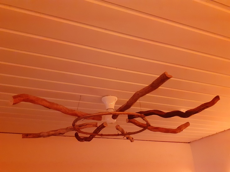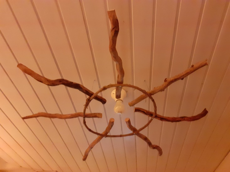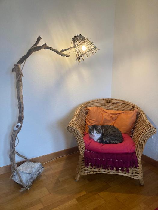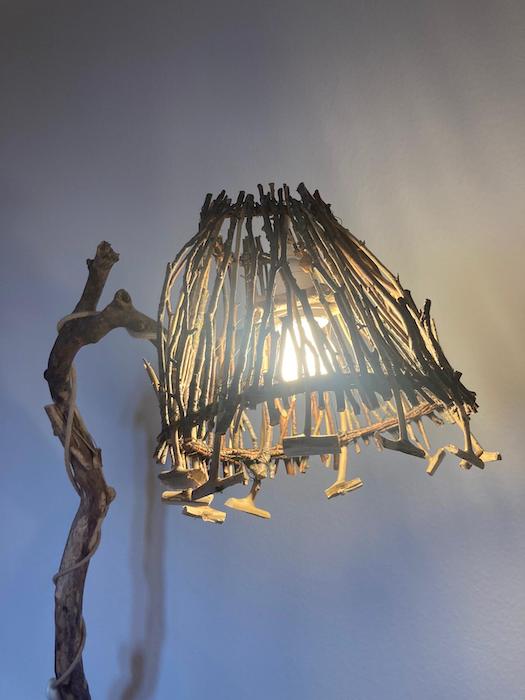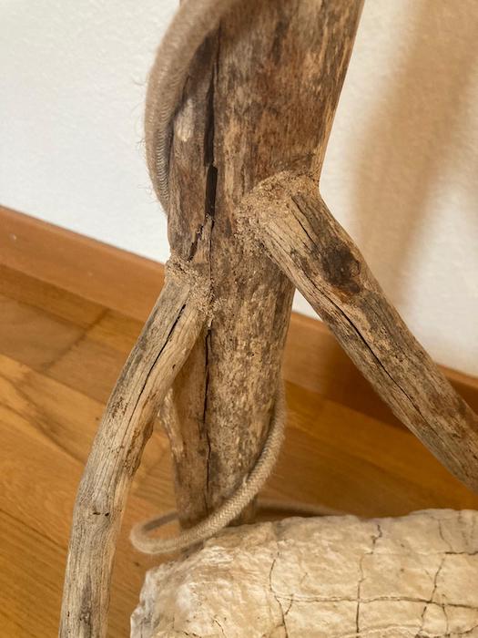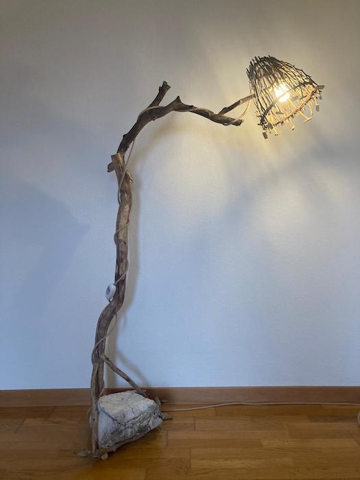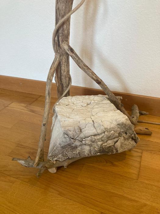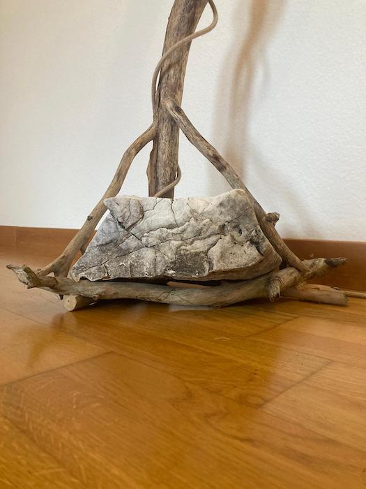 Ständerlampe Ein Jurastein gibt jetzt Ästen Halt statt Wurzeln. Die Äste heben den Lampenschirm empor, in drei Höhen, und bilden den Halter der Lampenbirne: ein Steinastlampenbirnenhalter. |