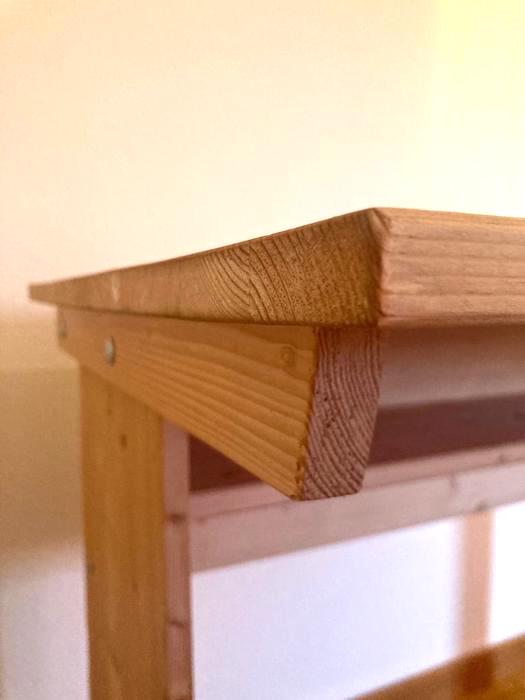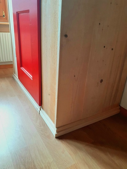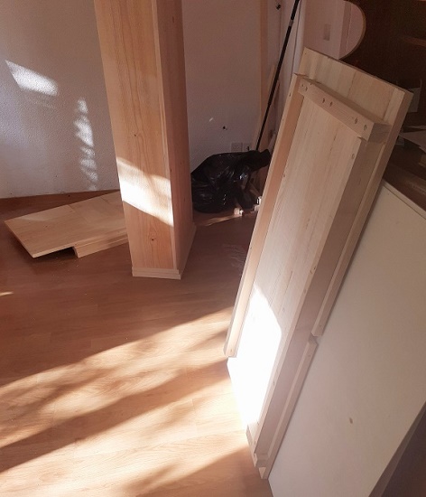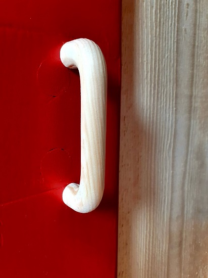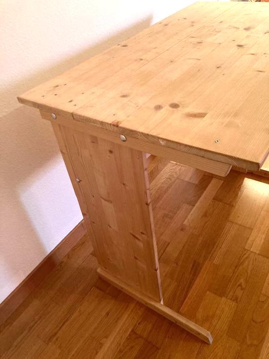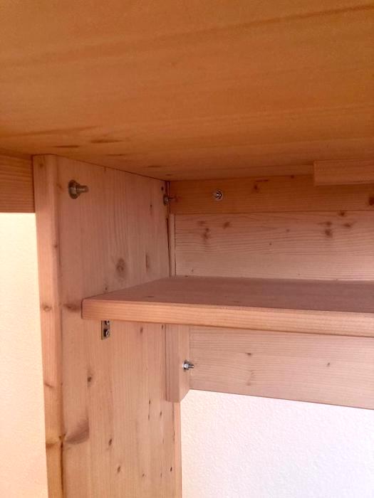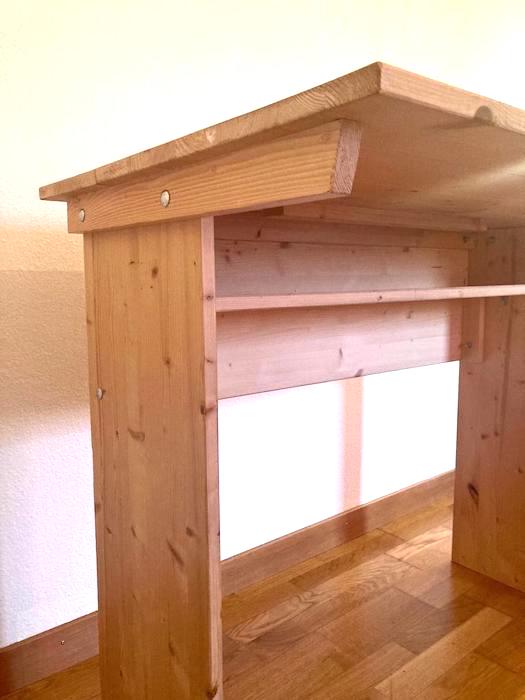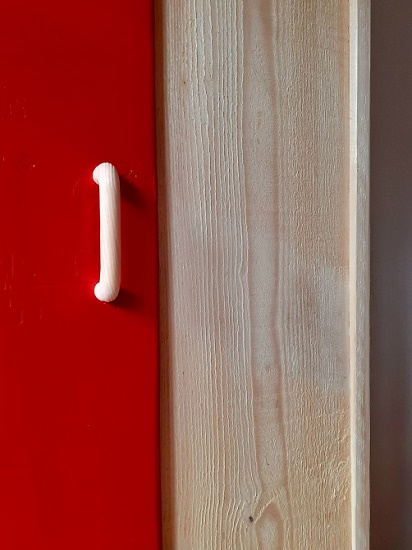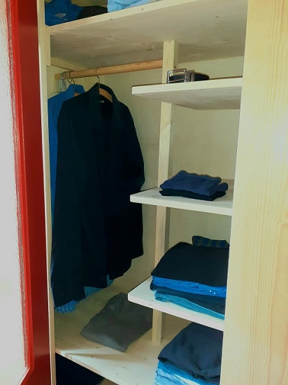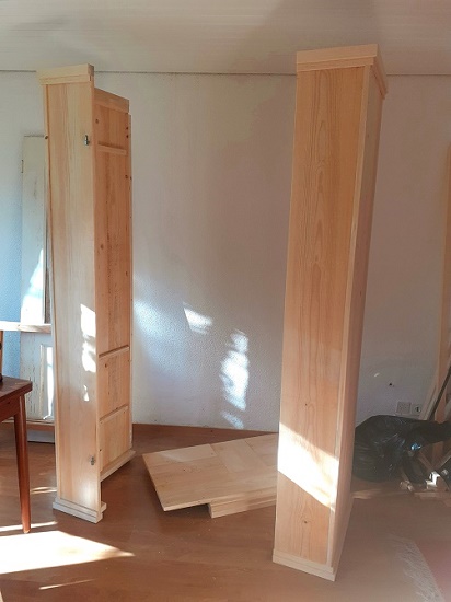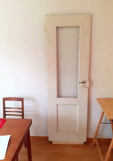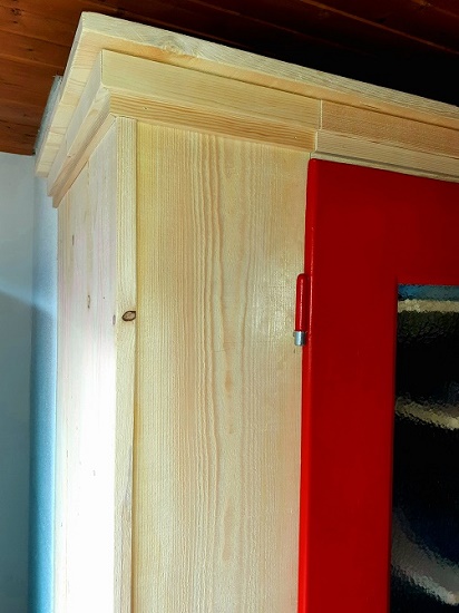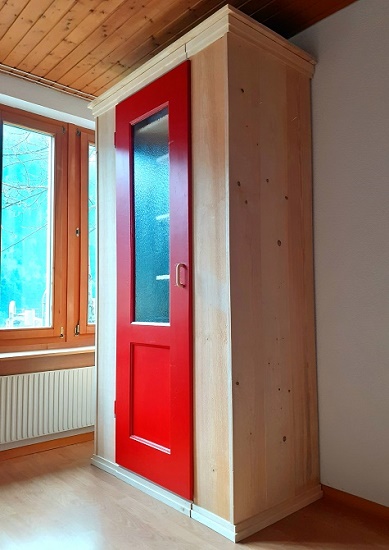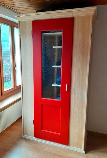Kleiderschrank Aus der alten Zimmertüre mit Riffelglas und ungehobelten Fichtenbrettern ist ein grosser Kleiderschrank entstanden. H: 220 cm, B: 125 cm, T: 65 cm; auseinandernehmbar. |