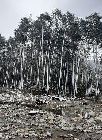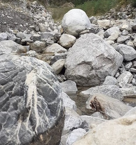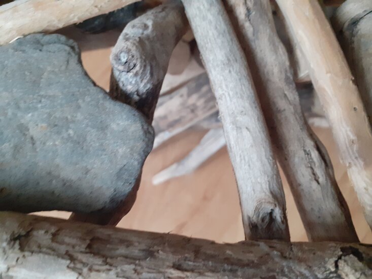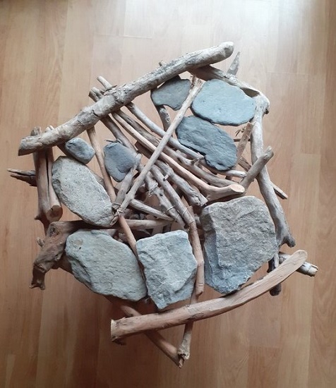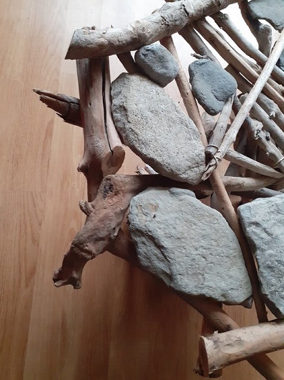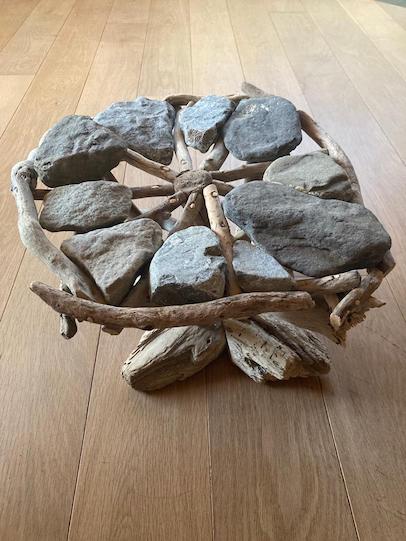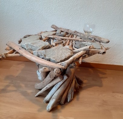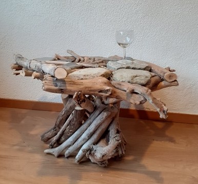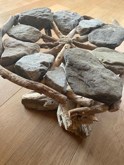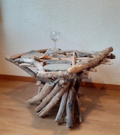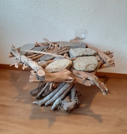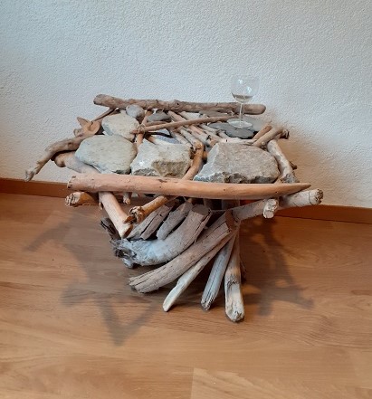 Delta-Tischli Der Wildbach schwemmt Steine und Holz an, kreuz und quer, zu dichten Ablagerungen. Delta für die Stube, ca. 70 x 60 x 40 cm. |