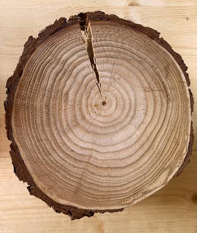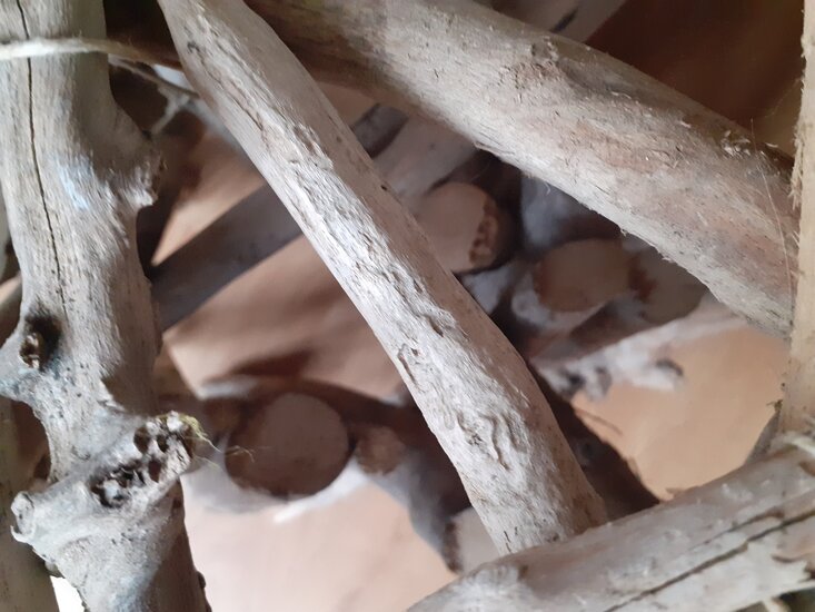 Tropfentablar Das Tablar mit sichtbarer Rinde an der Stirnseite wird von zwei Tropfen an der Wand gehalten. Oder sind es Flammen? |