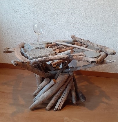 Rundes Steinholztischli Suchen statt Zufall: Nur Steine und Holzstücke, die zur fertigen Vorstellung passen, finden den Weg vom Wildbach in die Werkstatt und als Tisch in die Stube. |