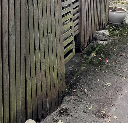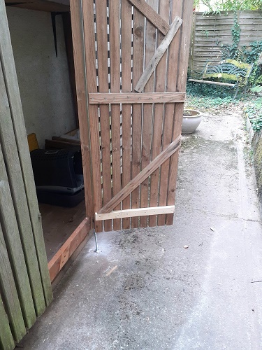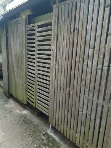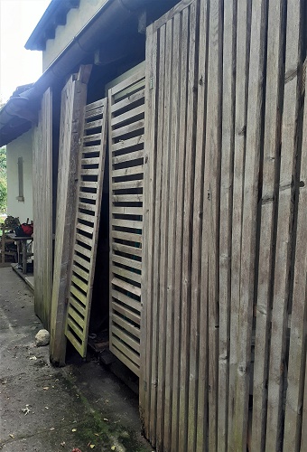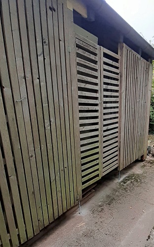 Türen Unterstand Die untersten, morschen 30 cm der Tore abgesägt, alles neu gerichtet und montiert. |