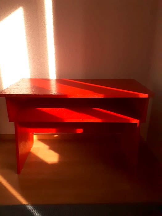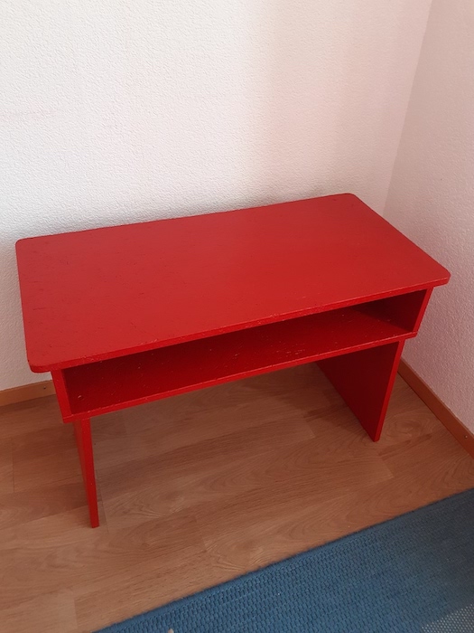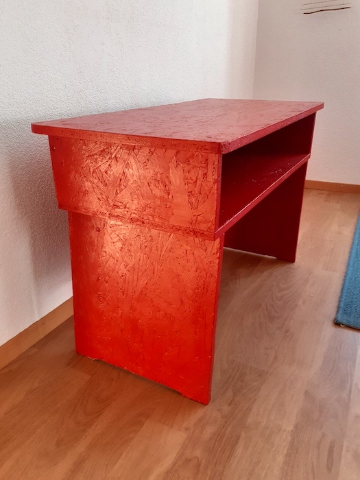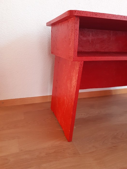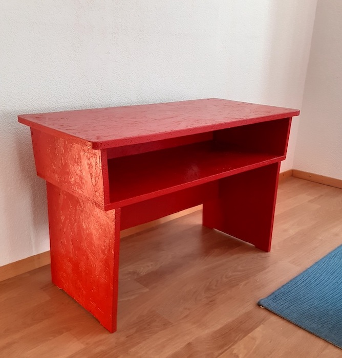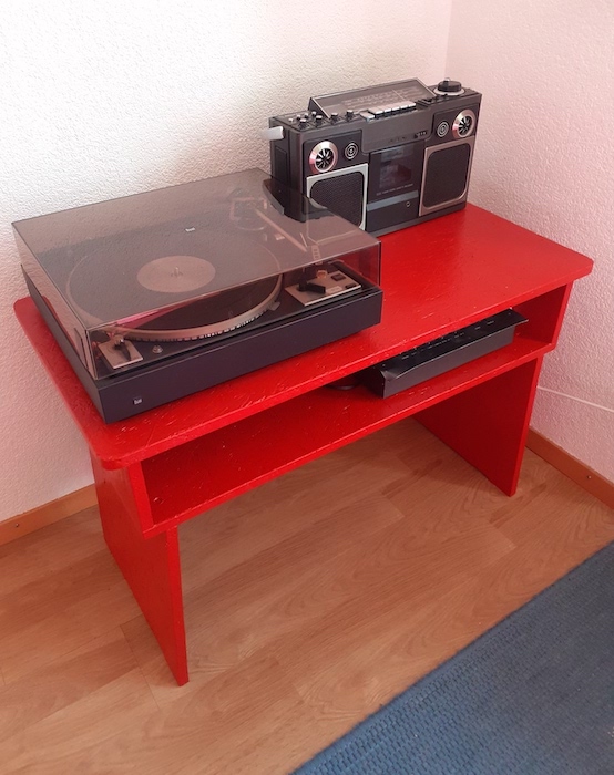 Wohnzimmermöbel Einfaches kleines Möbel aus OSB-Platten, auf Mass und mit Anstrich – ein neues Zuhause für einen Plattenspieler und ein Radio mit Geschichte. |